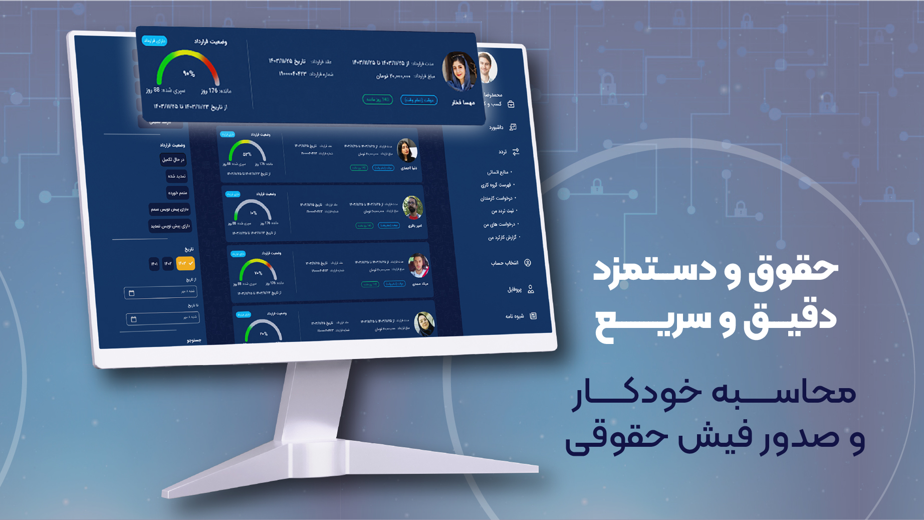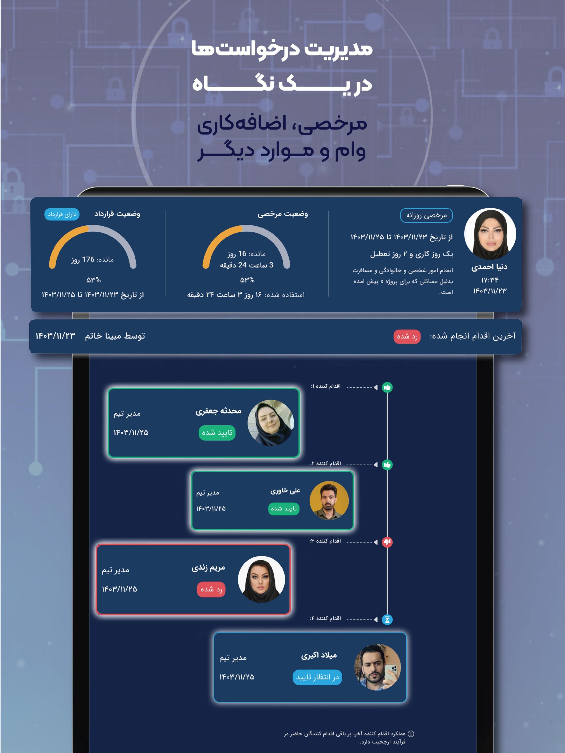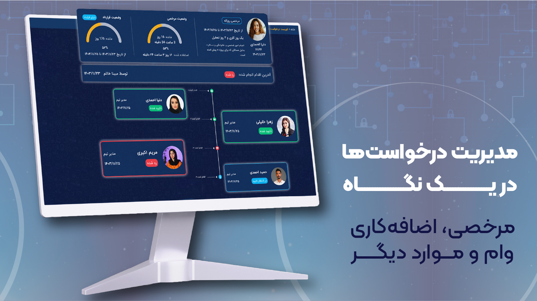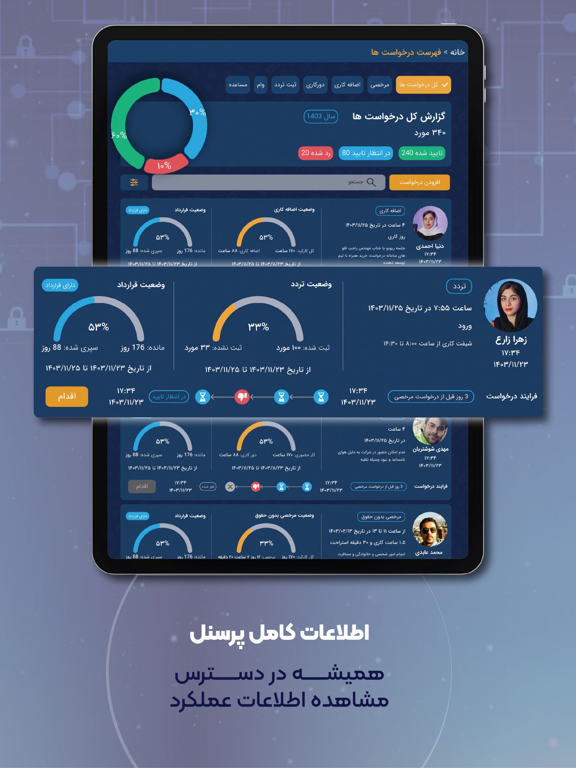 با استفاده از دسترنج میتوانید به راحتی اطلاعات پرسنل را ثبت کنید، درخواستهای مرخصی، اضافهکاری و وام را مدیریت کنید و با گزارشهای تحلیلی دقیق، تصمیمهای بهتری برای بهبود عملکرد سازمان بگیرید.
